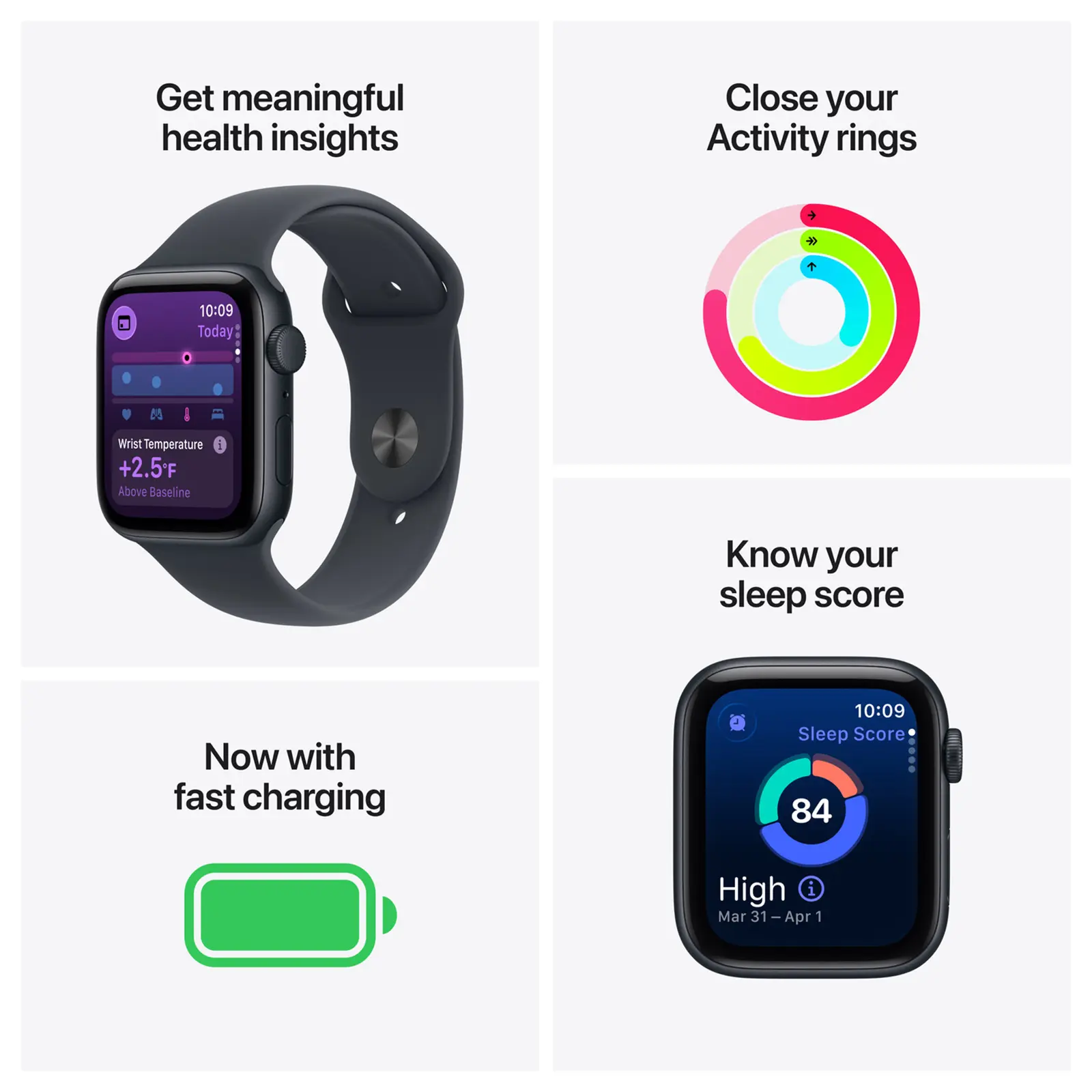 Het Retina LTPO OLED Always On display houdt belangrijke informatie zichtbaar in één oogopslag. Dankzij het grotere 44mm formaat is er meer ruimte voor meldingen, widgets en activiteitsgegevens, wat zorgt voor extra leesbaarheid gedurende de dag of tijdens het sporten.