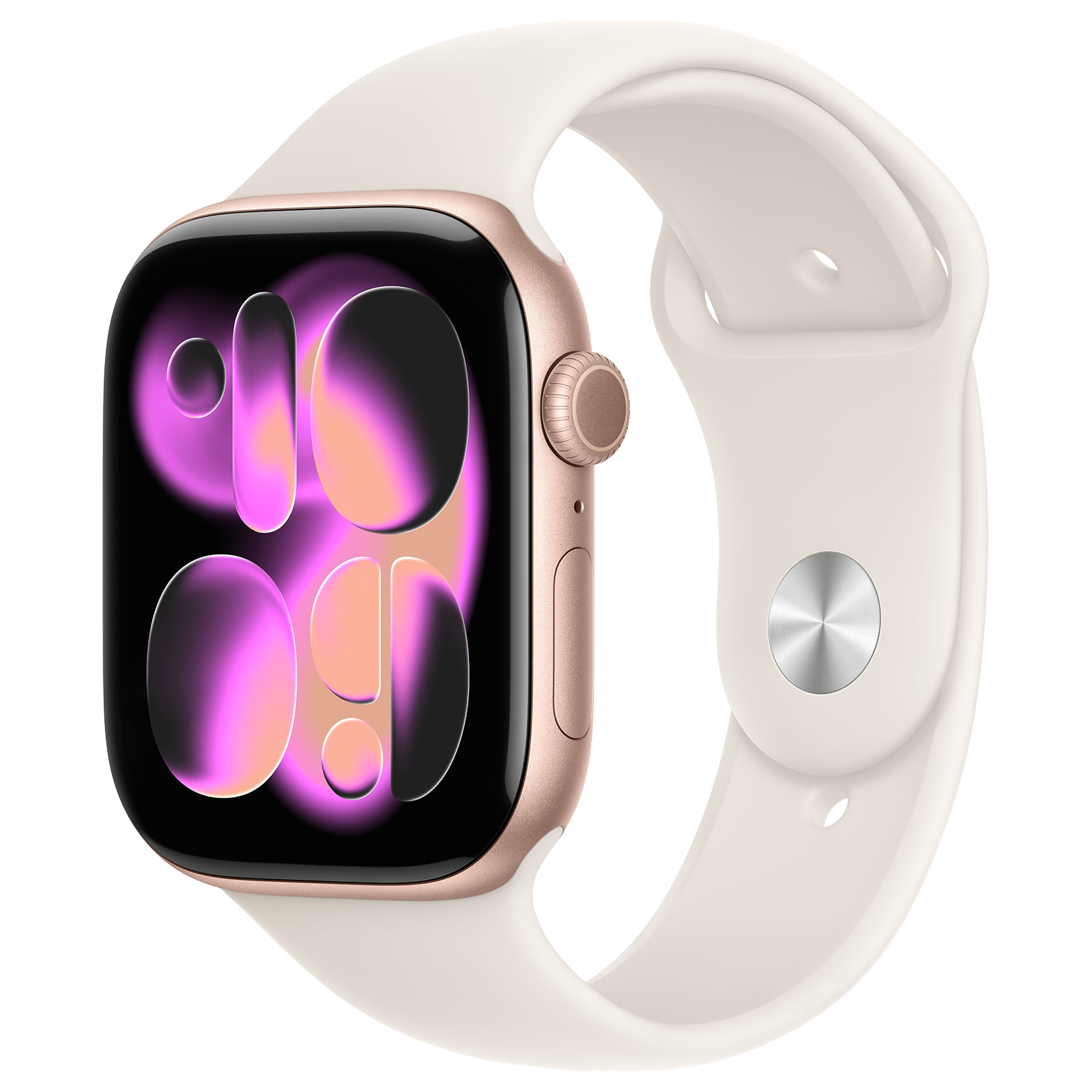 Beschrijving Apple Watch Series 11 46mm – Rosegoud Aluminium Sterrenlicht Sportband