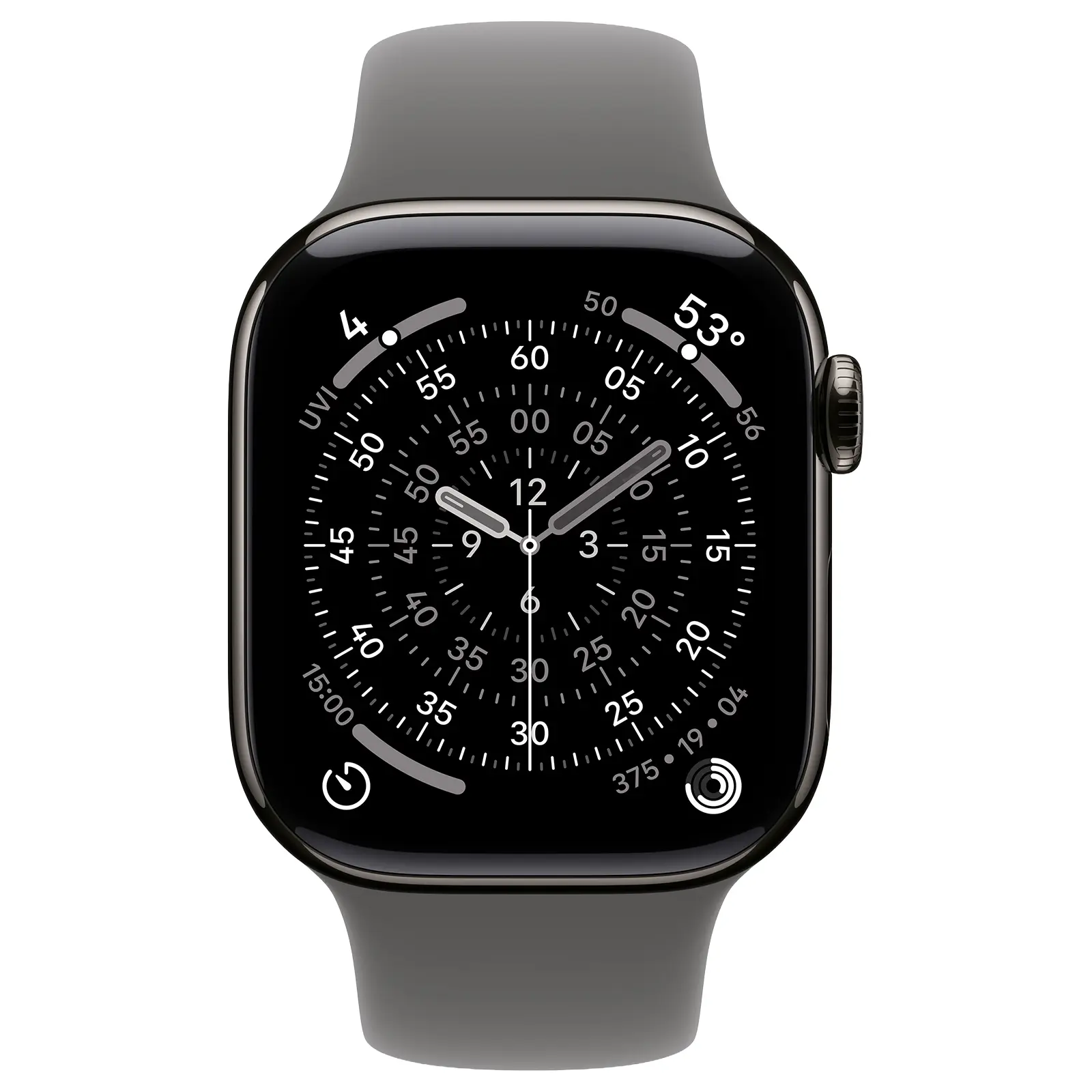 De leisteen titanium kast combineert een luxe uitstraling met een licht en sterk materiaal, ontworpen voor intensief dagelijks gebruik. De voorkant is afgewerkt met saffierkristal, dat goed bestand is tegen krassen. De ceramic achterkant draagt bij aan de premium afwerking. De rotsgrijze sportband voelt comfortabel aan en past bij zowel sportieve als casual outfits.